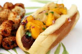 Combine 1/4 cup sour cream and 2 TBSP Sweet chilli sauce and 1 TBSP finely chopped coriander in a small bowl. Spoon this sauce over hotdogs.